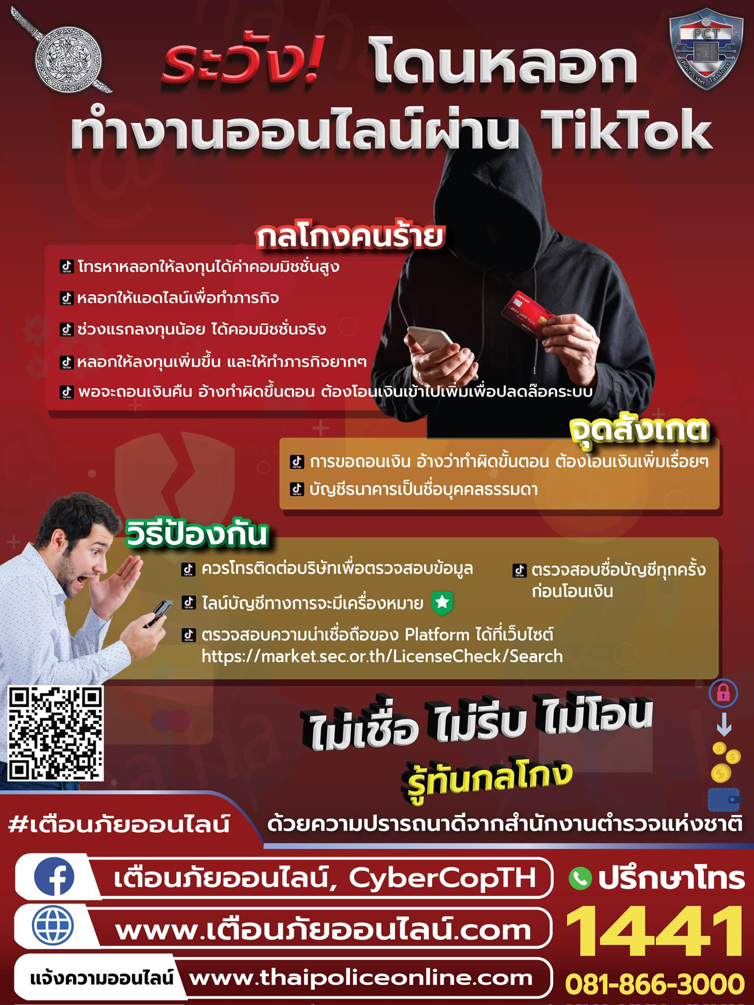 กลโกงของคนร้าย : 1. มิจฉาชีพใช้โทรศัพท์ โทรหาผู้เสียหายแนะนำตัวว่าโทรมาจาก tiktok อยากให้ช่วยทำการตล
