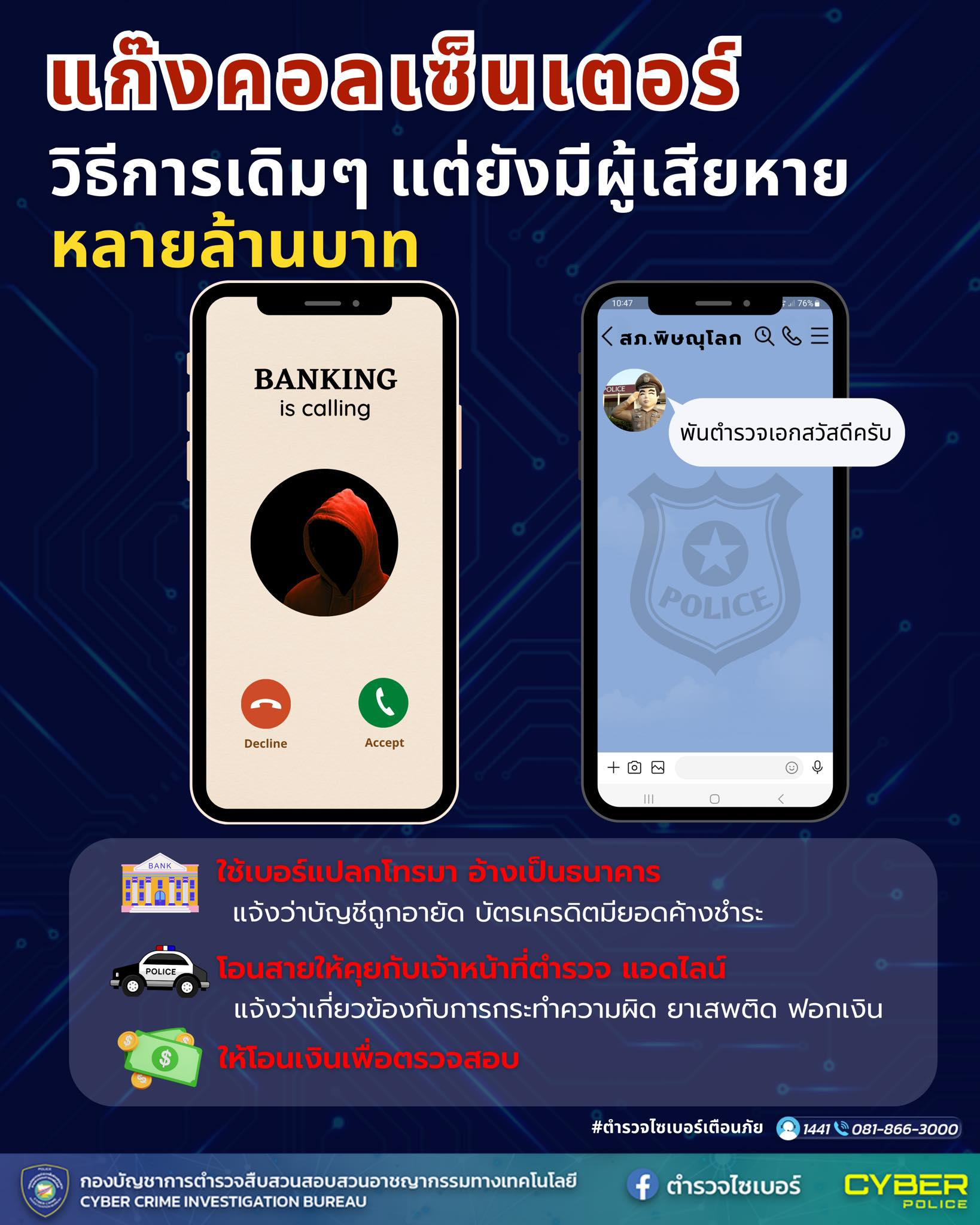 กลวิธีของคนร้าย 1.แก๊งคอลเซ็นเตอร์จะติดต่อเหยื่อทางโทรศัพท์ ผ่านทางข้อความเสียงอัตโนมัติ และให้คนร้า